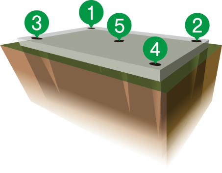 建物の荷重は隅にかかるので、SS試験では建物の四隅と中心がくる場所、計5ポイント程度を計測します。
